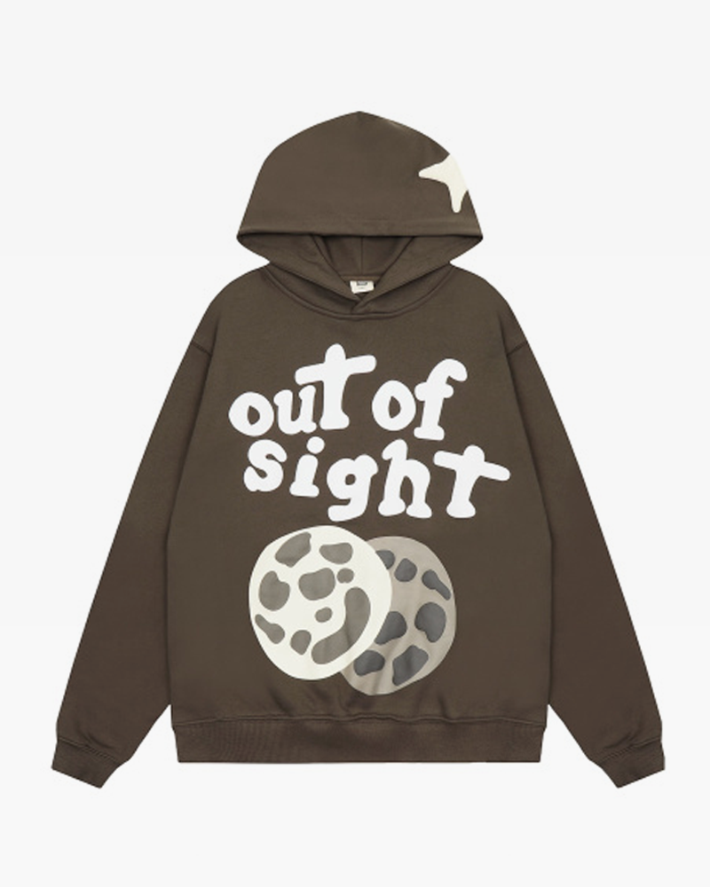 Our Out Of Sight Hoodie, made of quality materials, features an embossed text print with two moons on front, and Y2K prints on hood and sleeve. Shop now!
