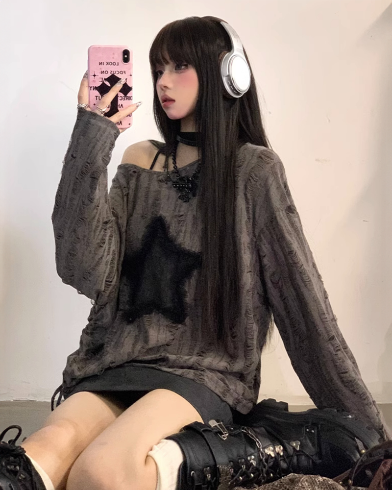 Our Y2K Off The Shoulder Top, made from quality materials, features a sewn-on star on the chest, a ripped effect and is available in 2 colors. Shop now!